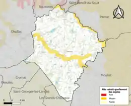 Le retrait-gonflement des sols argileux est susceptible d'engendrer des dommages importants aux bâtiments en cas d’alternance de périodes de sécheresse et de pluie. 10,2 % de la superficie communale est en aléa moyen ou fort (84,7 % au niveau départemental et 48,5 % au niveau national). Sur les 450 bâtiments dénombrés sur la commune en 2019, 34 sont en aléa moyen ou fort, soit 8 %, à comparer aux 86 % au niveau départemental et 54 % au niveau national. Une cartographie de l'exposition du territoire national au retrait gonflement des sols argileux est disponible sur le site du BRGM[21],[22].