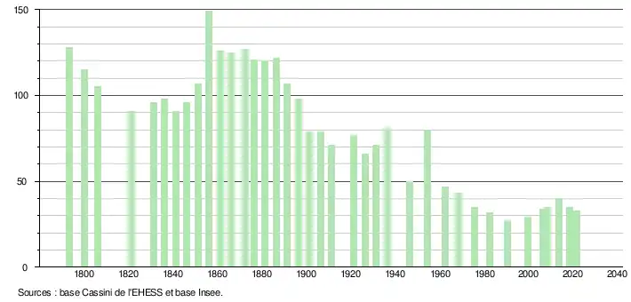 L'évolution du nombre d'habitants est connue à travers les recensements de la population effectués dans la commune depuis 1793. Pour les communes de moins de 10 000 habitants, une enquête de recensement portant sur toute la population est réalisée tous les cinq ans, les populations légales des années intermédiaires étant quant à elles estimées par interpolation ou extrapolation[18]. Pour la commune, le premier recensement exhaustif entrant dans le cadre du nouveau dispositif a été réalisé en 2008[19].
