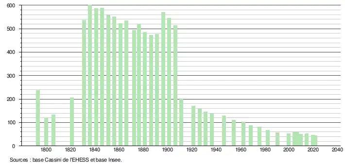 L'évolution du nombre d'habitants est connue à travers les recensements de la population effectués dans la commune depuis 1793. Pour les communes de moins de 10 000 habitants, une enquête de recensement portant sur toute la population est réalisée tous les cinq ans, les populations légales des années intermédiaires étant quant à elles estimées par interpolation ou extrapolation[16]. Pour la commune, le premier recensement exhaustif entrant dans le cadre du nouveau dispositif a été réalisé en 2004[17].