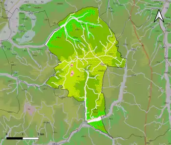 L'occupation des sols de la commune, telle qu'elle ressort de la base de données européenne d’occupation biophysique des sols Corine Land Cover (CLC), est marquée par l'importance des forêts et milieux semi-naturels (58,8 % en 2018), une proportion identique à celle de 1990 (58,5 %). La répartition détaillée en 2018 est la suivante : forêts (58,8 %), zones agricoles hétérogènes (28 %), prairies (6,6 %), terres arables (4,4 %), zones urbanisées (2,2 %)[33]. L'évolution de l’occupation des sols de la commune et de ses infrastructures peut être observée sur les différentes représentations cartographiques du territoire : la carte de Cassini (XVIIIe siècle), la carte d'état-major (1820-1866) et les cartes ou photos aériennes de l'IGN pour la période actuelle (1950 à aujourd'hui)[Carte 3].