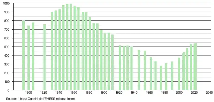 L'évolution du nombre d'habitants est connue à travers les recensements de la population effectués dans la commune depuis 1793. Pour les communes de moins de 10 000 habitants, une enquête de recensement portant sur toute la population est réalisée tous les cinq ans, les populations légales des années intermédiaires étant quant à elles estimées par interpolation ou extrapolation[45]. Pour la commune, le premier recensement exhaustif entrant dans le cadre du nouveau dispositif a été réalisé en 2005[46].