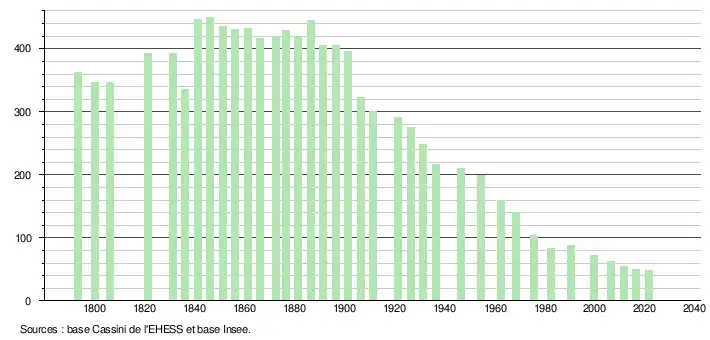 L'évolution du nombre d'habitants est connue à travers les recensements de la population effectués dans la commune depuis 1793. Pour les communes de moins de 10 000 habitants, une enquête de recensement portant sur toute la population est réalisée tous les cinq ans, les populations légales des années intermédiaires étant quant à elles estimées par interpolation ou extrapolation[43]. Pour la commune, le premier recensement exhaustif entrant dans le cadre du nouveau dispositif a été réalisé en 2006[44].