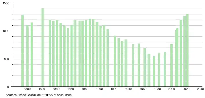 L'évolution du nombre d'habitants est connue à travers les recensements de la population effectués dans la commune depuis 1793. Pour les communes de moins de 10 000 habitants, une enquête de recensement portant sur toute la population est réalisée tous les cinq ans, les populations légales des années intermédiaires étant quant à elles estimées par interpolation ou extrapolation[29]. Pour la commune, le premier recensement exhaustif entrant dans le cadre du nouveau dispositif a été réalisé en 2007[30].