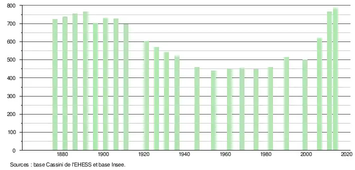 L'évolution du nombre d'habitants est connue à travers les recensements de la population effectués dans la commune depuis 1876. À partir du , les populations légales des communes sont publiées annuellement dans le cadre d'un recensement qui repose désormais sur une collecte d'information annuelle, concernant successivement tous les territoires communaux au cours d'une période de cinq ans. Pour les communes de moins de 10 000 habitants, une enquête de recensement portant sur toute la population est réalisée tous les cinq ans, les populations légales des années intermédiaires étant quant à elles estimées par interpolation ou extrapolation[5]. Pour la commune, le premier recensement exhaustif entrant dans le cadre du nouveau dispositif a été réalisé en 2006[6],[Note 1].