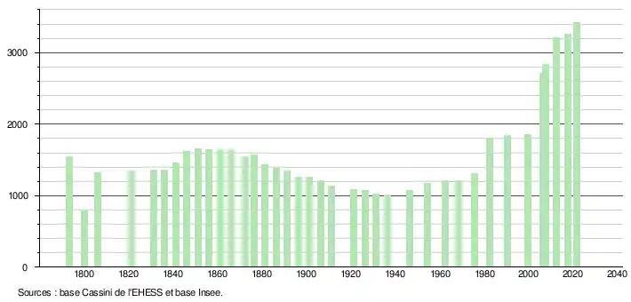L'évolution du nombre d'habitants est connue à travers les recensements de la population effectués dans la commune depuis 1793. Pour les communes de moins de 10 000 habitants, une enquête de recensement portant sur toute la population est réalisée tous les cinq ans, les populations légales des années intermédiaires étant quant à elles estimées par interpolation ou extrapolation[21]. Pour la commune, le premier recensement exhaustif entrant dans le cadre du nouveau dispositif a été réalisé en 2007[22].