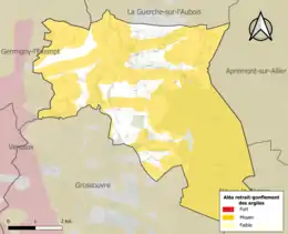 La commune est vulnérable au risque de mouvements de terrains constitué principalement du retrait-gonflement des sols argileux[17]. Cet aléa est susceptible d'engendrer des dommages importants aux bâtiments en cas d’alternance de périodes de sécheresse et de pluie. 79,2 % de la superficie communale est en aléa moyen ou fort (90 % au niveau départemental et 48,5 % au niveau national). Sur les 247 bâtiments dénombrés sur la commune en 2019, 161 sont en aléa moyen ou fort, soit 65 %, à comparer aux 83 % au niveau départemental et 54 % au niveau national. Une cartographie de l'exposition du territoire national au retrait gonflement des sols argileux est disponible sur le site du BRGM[18],[Carte 2].
