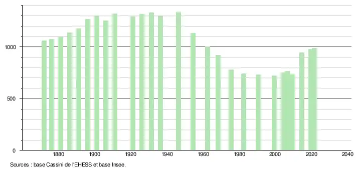 L'évolution du nombre d'habitants est connue à travers les recensements de la population effectués dans la commune depuis 1872. Pour les communes de moins de 10 000 habitants, une enquête de recensement portant sur toute la population est réalisée tous les cinq ans, les populations légales des années intermédiaires étant quant à elles estimées par interpolation ou extrapolation[16]. Pour la commune, le premier recensement exhaustif entrant dans le cadre du nouveau dispositif a été réalisé en 2004[17].