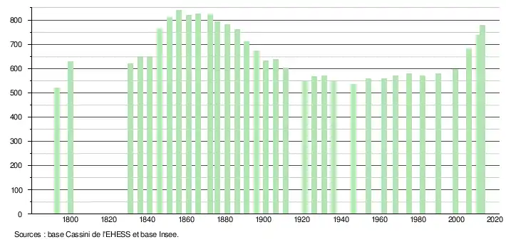 L'évolution du nombre d'habitants est connue à travers les recensements de la population effectués dans la commune depuis 1793. À partir du , les populations légales des communes sont publiées annuellement dans le cadre d'un recensement qui repose désormais sur une collecte d'information annuelle, concernant successivement tous les territoires communaux au cours d'une période de cinq ans. Pour les communes de moins de 10 000 habitants, une enquête de recensement portant sur toute la population est réalisée tous les cinq ans, les populations légales des années intermédiaires étant quant à elles estimées par interpolation ou extrapolation[9]. Pour la commune, le premier recensement exhaustif entrant dans le cadre du nouveau dispositif a été réalisé en 2006[10],[Note 1].