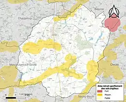Les mouvements de terrains susceptibles de se produire sur la commune sont des tassements différentiels[17]. Le retrait-gonflement des sols argileux est susceptible d'engendrer des dommages importants aux bâtiments en cas d’alternance de périodes de sécheresse et de pluie[18]. 21,7 % de la superficie communale est en aléa moyen ou fort (54,9 % au niveau départemental et 48,5 % au niveau national)[Carte 2]. Depuis le , en application de la loi ELAN, différentes contraintes s'imposent aux vendeurs, maîtres d'ouvrages ou constructeurs de biens situés dans une zone classée en aléa moyen ou fort[Note 4],[19].