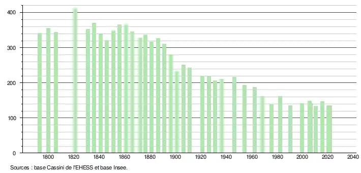 L'évolution du nombre d'habitants est connue à travers les recensements de la population effectués dans la commune depuis 1793. Pour les communes de moins de 10 000 habitants, une enquête de recensement portant sur toute la population est réalisée tous les cinq ans, les populations légales des années intermédiaires étant quant à elles estimées par interpolation ou extrapolation[34]. Pour la commune, le premier recensement exhaustif entrant dans le cadre du nouveau dispositif a été réalisé en 2005[35].