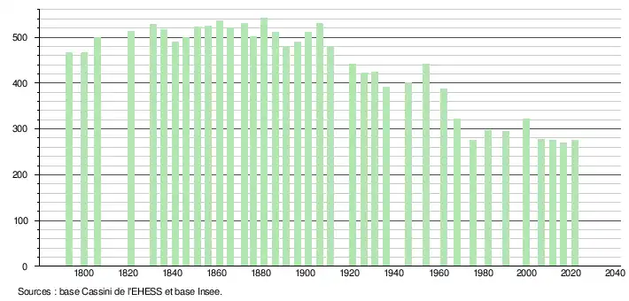 L'évolution du nombre d'habitants est connue à travers les recensements de la population effectués dans la commune depuis 1793. Pour les communes de moins de 10 000 habitants, une enquête de recensement portant sur toute la population est réalisée tous les cinq ans, les populations légales des années intermédiaires étant quant à elles estimées par interpolation ou extrapolation[24]. Pour la commune, le premier recensement exhaustif entrant dans le cadre du nouveau dispositif a été réalisé en 2006[25].