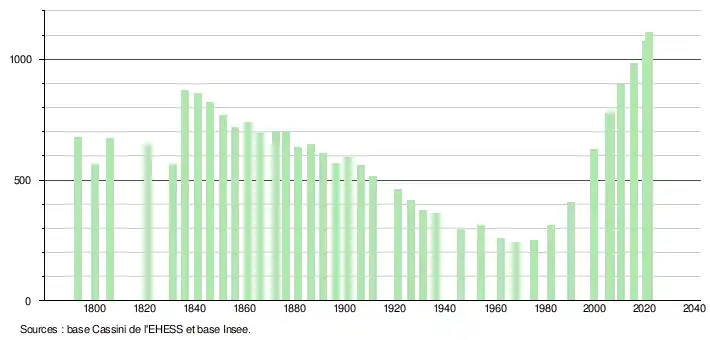 L'évolution du nombre d'habitants est connue à travers les recensements de la population effectués dans la commune depuis 1793. Pour les communes de moins de 10 000 habitants, une enquête de recensement portant sur toute la population est réalisée tous les cinq ans, les populations légales des années intermédiaires étant quant à elles estimées par interpolation ou extrapolation[19]. Pour la commune, le premier recensement exhaustif entrant dans le cadre du nouveau dispositif a été réalisé en 2005[20].