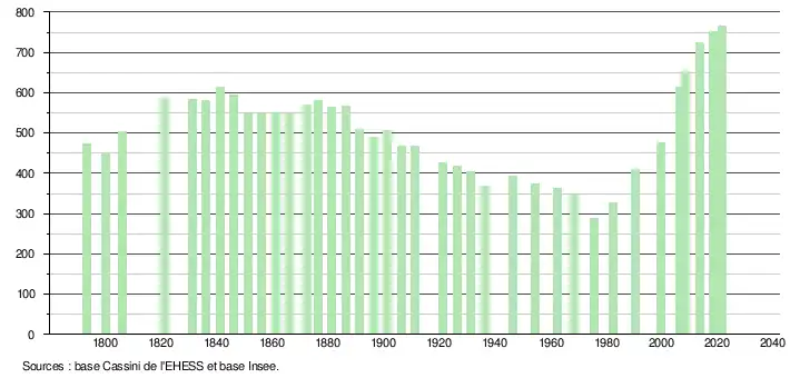 L'évolution du nombre d'habitants est connue à travers les recensements de la population effectués dans la commune depuis 1793. Pour les communes de moins de 10 000 habitants, une enquête de recensement portant sur toute la population est réalisée tous les cinq ans, les populations légales des années intermédiaires étant quant à elles estimées par interpolation ou extrapolation[16]. Pour la commune, le premier recensement exhaustif entrant dans le cadre du nouveau dispositif a été réalisé en 2008[17].