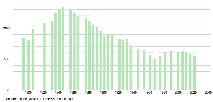 L'évolution du nombre d'habitants est connue à travers les recensements de la population effectués dans la commune depuis 1793. Pour les communes de moins de 10 000 habitants, une enquête de recensement portant sur toute la population est réalisée tous les cinq ans, les populations légales des années intermédiaires étant quant à elles estimées par interpolation ou extrapolation[18]. Pour la commune, le premier recensement exhaustif entrant dans le cadre du nouveau dispositif a été réalisé en 2005[19].