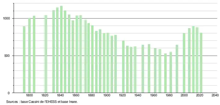 L'évolution du nombre d'habitants est connue à travers les recensements de la population effectués dans la commune depuis 1793. Pour les communes de moins de 10 000 habitants, une enquête de recensement portant sur toute la population est réalisée tous les cinq ans, les populations légales des années intermédiaires étant quant à elles estimées par interpolation ou extrapolation[16]. Pour la commune, le premier recensement exhaustif entrant dans le cadre du nouveau dispositif a été réalisé en 2006[17].