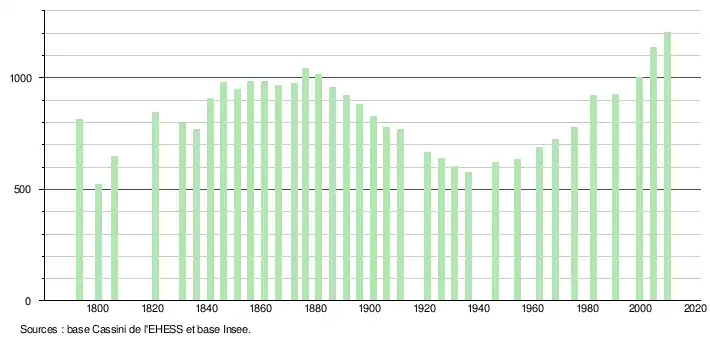 L'évolution du nombre d'habitants est connue à travers les recensements de la population effectués dans la commune depuis 1793. À partir du , les populations légales des communes sont publiées annuellement dans le cadre d'un recensement qui repose désormais sur une collecte d'information annuelle, concernant successivement tous les territoires communaux au cours d'une période de cinq ans. Pour les communes de moins de 10 000 habitants, une enquête de recensement portant sur toute la population est réalisée tous les cinq ans, les populations légales des années intermédiaires étant quant à elles estimées par interpolation ou extrapolation[10]. Pour la commune, le premier recensement exhaustif entrant dans le cadre du nouveau dispositif a été réalisé en 2004[11],[Note 1].