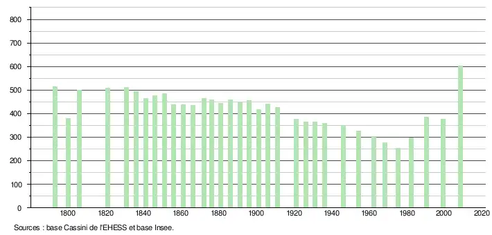 L'évolution du nombre d'habitants est connue à travers les recensements de la population effectués dans la commune depuis 1793. À partir du , les populations légales des communes sont publiées annuellement dans le cadre d'un recensement qui repose désormais sur une collecte d'information annuelle, concernant successivement tous les territoires communaux au cours d'une période de cinq ans. Pour les communes de moins de 10 000 habitants, une enquête de recensement portant sur toute la population est réalisée tous les cinq ans, les populations légales des années intermédiaires étant quant à elles estimées par interpolation ou extrapolation[3]. Pour la commune, le premier recensement exhaustif entrant dans le cadre du nouveau dispositif a été réalisé en 2008[4],[Note 1].