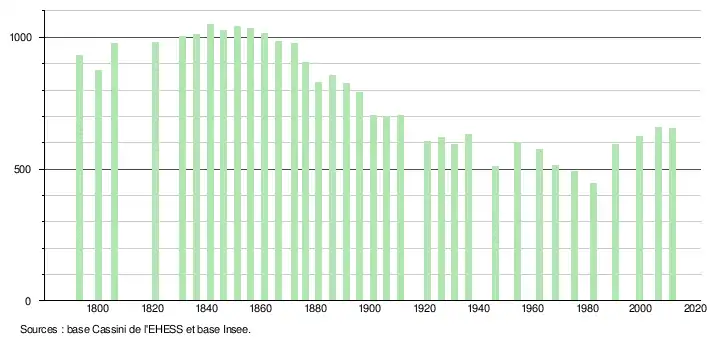 - Dans le tableau des recensements et le graphique, par convention dans Wikipédia, le principe a été retenu, pour les populations légales postérieures à 1999 de n’afficher dans le tableau des recensements et le graphique que les populations correspondant à l'année 2006, première population légale publiée calculée conformément aux concepts définis dans le décret no 2003-485 du 5 juin 2003, et les années correspondant à une enquête exhaustive de recensement pour les communes de moins de 10 000 habitants, ainsi que la dernière population légale publiée par l’Insee.