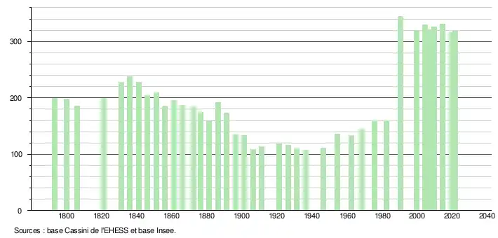L'évolution du nombre d'habitants est connue à travers les recensements de la population effectués dans la commune depuis 1793. Pour les communes de moins de 10 000 habitants, une enquête de recensement portant sur toute la population est réalisée tous les cinq ans, les populations légales des années intermédiaires étant quant à elles estimées par interpolation ou extrapolation[25]. Pour la commune, le premier recensement exhaustif entrant dans le cadre du nouveau dispositif a été réalisé en 2004[26].