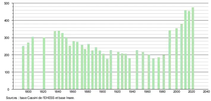 L'évolution du nombre d'habitants est connue à travers les recensements de la population effectués dans la commune depuis 1793. Pour les communes de moins de 10 000 habitants, une enquête de recensement portant sur toute la population est réalisée tous les cinq ans, les populations légales des années intermédiaires étant quant à elles estimées par interpolation ou extrapolation[28]. Pour la commune, le premier recensement exhaustif entrant dans le cadre du nouveau dispositif a été réalisé en 2006[29].