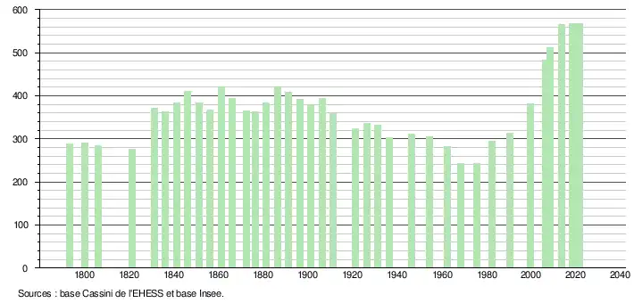 L'évolution du nombre d'habitants est connue à travers les recensements de la population effectués dans la commune depuis 1793. Pour les communes de moins de 10 000 habitants, une enquête de recensement portant sur toute la population est réalisée tous les cinq ans, les populations légales des années intermédiaires étant quant à elles estimées par interpolation ou extrapolation[16]. Pour la commune, le premier recensement exhaustif entrant dans le cadre du nouveau dispositif a été réalisé en 2008[17].