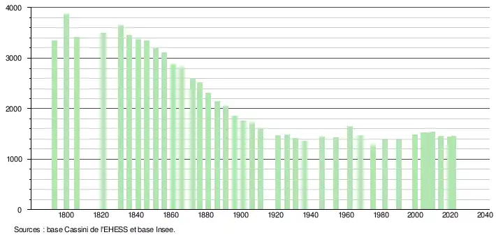 L'évolution du nombre d'habitants est connue à travers les recensements de la population effectués dans la commune depuis 1793. Pour les communes de moins de 10 000 habitants, une enquête de recensement portant sur toute la population est réalisée tous les cinq ans, les populations légales des années intermédiaires étant quant à elles estimées par interpolation ou extrapolation[35]. Pour la commune, le premier recensement exhaustif entrant dans le cadre du nouveau dispositif a été réalisé en 2004[36].