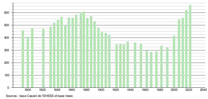 L'évolution du nombre d'habitants est connue à travers les recensements de la population effectués dans la commune depuis 1793. Pour les communes de moins de 10 000 habitants, une enquête de recensement portant sur toute la population est réalisée tous les cinq ans, les populations légales des années intermédiaires étant quant à elles estimées par interpolation ou extrapolation[19]. Pour la commune, le premier recensement exhaustif entrant dans le cadre du nouveau dispositif a été réalisé en 2006[20].