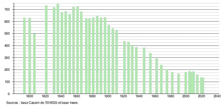 L'évolution du nombre d'habitants est connue à travers les recensements de la population effectués dans la commune depuis 1793. Pour les communes de moins de 10 000 habitants, une enquête de recensement portant sur toute la population est réalisée tous les cinq ans, les populations légales des années intermédiaires étant quant à elles estimées par interpolation ou extrapolation[20]. Pour la commune, le premier recensement exhaustif entrant dans le cadre du nouveau dispositif a été réalisé en 2004[21].