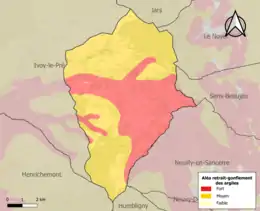 La commune est vulnérable au risque de mouvements de terrains constitué principalement du retrait-gonflement des sols argileux[15]. Cet aléa est susceptible d'engendrer des dommages importants aux bâtiments en cas d’alternance de périodes de sécheresse et de pluie. La totalité de la commune est en aléa moyen ou fort (90 % au niveau départemental et 48,5 % au niveau national). Sur les 147 bâtiments dénombrés sur la commune en 2019, 147 sont en aléa moyen ou fort, soit 100 %, à comparer aux 83 % au niveau départemental et 54 % au niveau national. Une cartographie de l'exposition du territoire national au retrait gonflement des sols argileux est disponible sur le site du BRGM[16],[Carte 2].