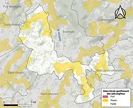 Le retrait-gonflement des sols argileux est susceptible d'engendrer des dommages importants aux bâtiments en cas d’alternance de périodes de sécheresse et de pluie. 31,2 % de la superficie communale est en aléa moyen ou fort (33,6 % au niveau départemental et 48,5 % au niveau national). Sur les 71 bâtiments dénombrés sur la commune en 2019, 7 sont en aléa moyen ou fort, soit 10 %, à comparer aux 25 % au niveau départemental et 54 % au niveau national. Une cartographie de l'exposition du territoire national au retrait gonflement des sols argileux est disponible sur le site du BRGM[18],[Carte 2].
