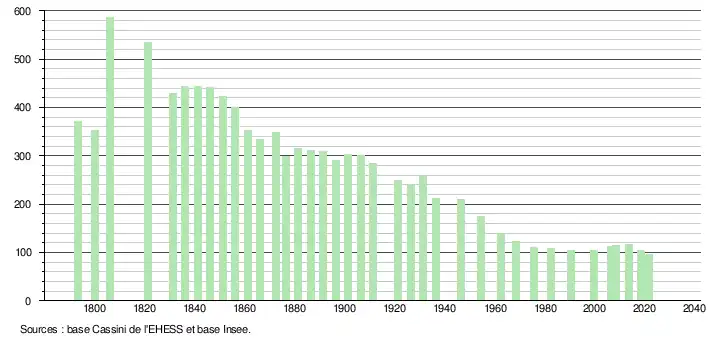 L'évolution du nombre d'habitants est connue à travers les recensements de la population effectués dans la commune depuis 1793. Pour les communes de moins de 10 000 habitants, une enquête de recensement portant sur toute la population est réalisée tous les cinq ans, les populations légales des années intermédiaires étant quant à elles estimées par interpolation ou extrapolation[21]. Pour la commune, le premier recensement exhaustif entrant dans le cadre du nouveau dispositif a été réalisé en 2008[22].