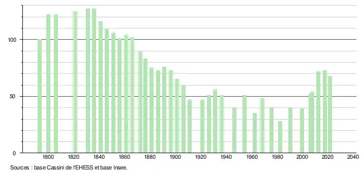 L'évolution du nombre d'habitants est connue à travers les recensements de la population effectués dans la commune depuis 1793. Pour les communes de moins de 10 000 habitants, une enquête de recensement portant sur toute la population est réalisée tous les cinq ans, les populations légales des années intermédiaires étant quant à elles estimées par interpolation ou extrapolation[32]. Pour la commune, le premier recensement exhaustif entrant dans le cadre du nouveau dispositif a été réalisé en 2007[33].