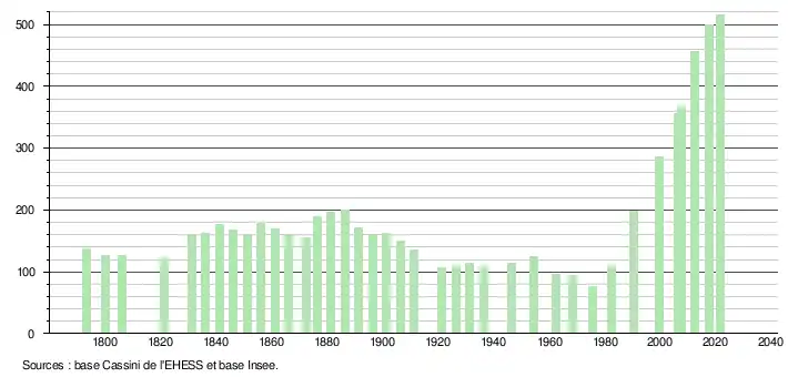 L'évolution du nombre d'habitants est connue à travers les recensements de la population effectués dans la commune depuis 1793. Pour les communes de moins de 10 000 habitants, une enquête de recensement portant sur toute la population est réalisée tous les cinq ans, les populations légales des années intermédiaires étant quant à elles estimées par interpolation ou extrapolation[20]. Pour la commune, le premier recensement exhaustif entrant dans le cadre du nouveau dispositif a été réalisé en 2007[21].