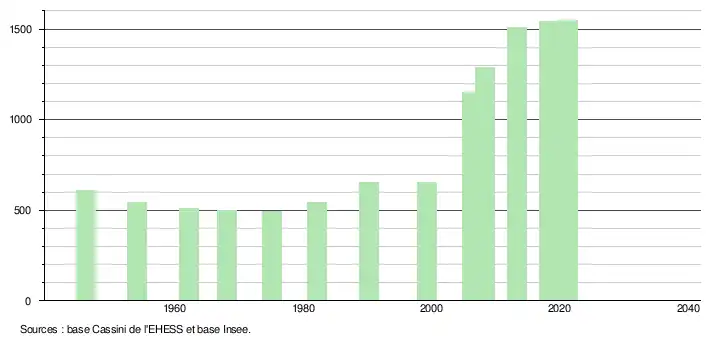 L'évolution du nombre d'habitants est connue à travers les recensements de la population effectués dans la commune depuis 1946. Pour les communes de moins de 10 000 habitants, une enquête de recensement portant sur toute la population est réalisée tous les cinq ans, les populations légales des années intermédiaires étant quant à elles estimées par interpolation ou extrapolation[22]. Pour la commune, le premier recensement exhaustif entrant dans le cadre du nouveau dispositif a été réalisé en 2008[23].
