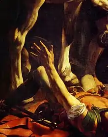 Des zones laissées libres côtoient d'autres beaucoup plus denses où des éléments se rapprochent : Stefano Zuffi souligne ainsi la proximité entre la patte levée du cheval et les jambes noueuses du palefrenier, ou encore entre son poing vigoureusement fermé sur le mors, en contraste avec la main ouverte du saint[39]. Le poète et critique d'art Yves Bonnefoy évoque également les choix de composition de Caravage en soulignant sa différence par rapport aux autres peintres de son époque, qui travaillent dans l'espace délimité par le cadre ; Caravage joue au contraire avec les limites de l'espace de sa toile, et « c'est tout juste si son saint Paul y trouve place » :