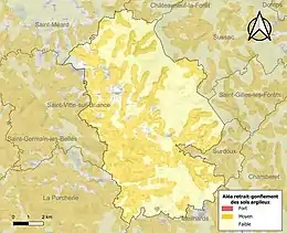 Le retrait-gonflement des sols argileux est susceptible d'engendrer des dommages importants aux bâtiments en cas d’alternance de périodes de sécheresse et de pluie[17]. 53,4 % de la superficie communale est en aléa moyen ou fort (27 % au niveau départemental et 48,5 % au niveau national métropolitain)[Carte 2]. Depuis le , en application de la loi ÉLAN, différentes contraintes s'imposent aux vendeurs, maîtres d'ouvrages ou constructeurs de biens situés dans une zone classée en aléa moyen ou fort[Note 3],[18].