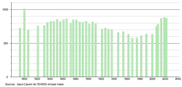 L'évolution du nombre d'habitants est connue à travers les recensements de la population effectués dans la commune depuis 1793. Pour les communes de moins de 10 000 habitants, une enquête de recensement portant sur toute la population est réalisée tous les cinq ans, les populations légales des années intermédiaires étant quant à elles estimées par interpolation ou extrapolation[17]. Pour la commune, le premier recensement exhaustif entrant dans le cadre du nouveau dispositif a été réalisé en 2008[18].