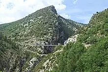 - Quatre ponts ont été construits pour enjamber les gorges profondes de la Roudoule : du plus ancien, il ne reste plus que la culée d'un pont en bois disparu ; un pont en pierre a été édifié au XVe siècle ou XVIe siècle[19] ; un second pont en pierre fut construit en 1852 ; le pont suspendu de Saint-Léger, réalisé en 1899 par l'entreprise de Ferdinand Arnodin, a une portée de 34,60 m[20].