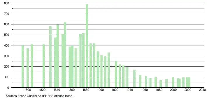L'évolution du nombre d'habitants est connue à travers les recensements de la population effectués dans la commune depuis 1793. Pour les communes de moins de 10 000 habitants, une enquête de recensement portant sur toute la population est réalisée tous les cinq ans, les populations légales des années intermédiaires étant quant à elles estimées par interpolation ou extrapolation[15]. Pour la commune, le premier recensement exhaustif entrant dans le cadre du nouveau dispositif a été réalisé en 2008[16].