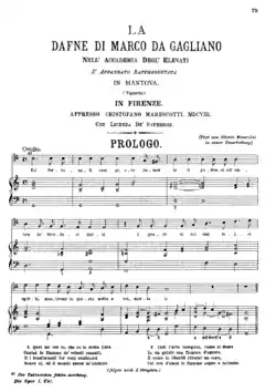 Le texte de La Dafne de Rinuccini est mis en musique une première fois par le compositeur, Jacopo Peri pendant le carnaval de 1597, au Palazzo Corsi, la maison de riches commerçants, avec l'aide du compositeur Jacopo Corsi[3]. Cette partition, bien que presque entièrement perdue, subsiste par six extraits musicaux. Elle est considérée comme la première pièce du répertoire aujourd'hui connu sous le nom d'opéra[4]. De cette composition, Rinuccini est cité comme disant : « La Dafne, écrite par moi seulement pour montrer dans une expérience simple, ce que la musique pouvait faire à notre âge, a été mis en musique si gracieusement par Péri qu'il a fait très plaisir à ceux qui l'ont entendu »[4]. La Dafne a été défini à l'origine comme une expérience qui découle de conversations par un groupe appelé la Camerata fiorentina. Les hommes de la Camerata fiorentina, cherchent à faire revivre le drame classique grec, en posant l'hypothèse que la totalité du texte était chanté à l'origine. À partir de ces expériences le stile recitativo, un style de chant qui imite la parole, a été créé (stile rappresentativo).