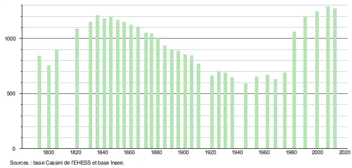 L'évolution du nombre d'habitants est connue à travers les recensements de la population effectués dans la commune depuis 1793. À partir du , les populations légales des communes sont publiées annuellement dans le cadre d'un recensement qui repose désormais sur une collecte d'information annuelle, concernant successivement tous les territoires communaux au cours d'une période de cinq ans. Pour les communes de moins de 10 000 habitants, une enquête de recensement portant sur toute la population est réalisée tous les cinq ans, les populations légales des années intermédiaires étant quant à elles estimées par interpolation ou extrapolation[7]. Pour la commune, le premier recensement exhaustif entrant dans le cadre du nouveau dispositif a été réalisé en 2007[8],[Note 1].