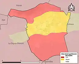 Le retrait-gonflement des sols argileux est susceptible d'engendrer des dommages importants aux bâtiments en cas d’alternance de périodes de sécheresse et de pluie. La totalité de la commune est en aléa moyen ou fort (75,2 % au niveau départemental et 48,5 % au niveau national). Sur les 249 bâtiments dénombrés sur la commune en 2019, 249 sont en aléa moyen ou fort, soit 100 %, à comparer aux 94 % au niveau départemental et 54 % au niveau national. Une cartographie de l'exposition du territoire national au retrait gonflement des sols argileux est disponible sur le site du BRGM[23],[Carte 3].