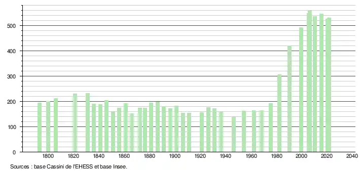 L'évolution du nombre d'habitants est connue à travers les recensements de la population effectués dans la commune depuis 1793. Pour les communes de moins de 10 000 habitants, une enquête de recensement portant sur toute la population est réalisée tous les cinq ans, les populations légales des années intermédiaires étant quant à elles estimées par interpolation ou extrapolation[29]. Pour la commune, le premier recensement exhaustif entrant dans le cadre du nouveau dispositif a été réalisé en 2005[30].