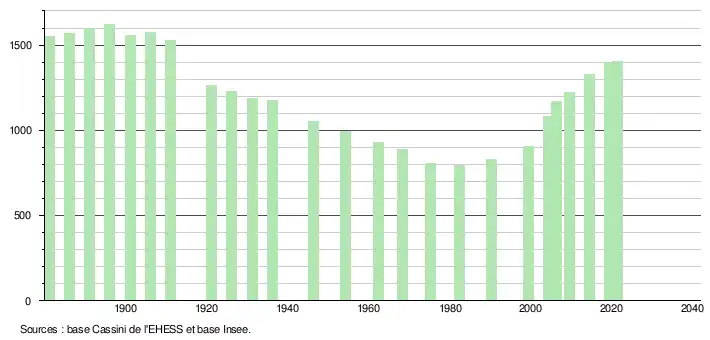 L'évolution du nombre d'habitants est connue à travers les recensements de la population effectués dans la commune depuis 1881. Pour les communes de moins de 10 000 habitants, une enquête de recensement portant sur toute la population est réalisée tous les cinq ans, les populations légales des années intermédiaires étant quant à elles estimées par interpolation ou extrapolation[19]. Pour la commune, le premier recensement exhaustif entrant dans le cadre du nouveau dispositif a été réalisé en 2004[20].