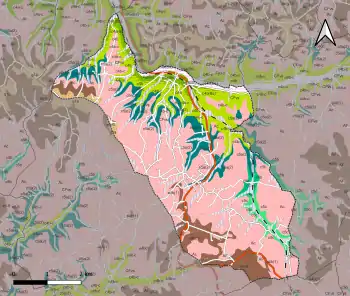 L'occupation des sols de la commune, telle qu'elle ressort de la base de données européenne d’occupation biophysique des sols Corine Land Cover (CLC), est marquée par l'importance des forêts et milieux semi-naturels (49,6 % en 2018), une proportion sensiblement équivalente à celle de 1990 (49 %). La répartition détaillée en 2018 est la suivante : forêts (49,1 %), zones agricoles hétérogènes (25,8 %), prairies (11,6 %), terres arables (11,2 %), zones industrielles ou commerciales et réseaux de communication (1,9 %), milieux à végétation arbustive et/ou herbacée (0,5 %)[29]. L'évolution de l’occupation des sols de la commune et de ses infrastructures peut être observée sur les différentes représentations cartographiques du territoire : la carte de Cassini (XVIIIe siècle), la carte d'état-major (1820-1866) et les cartes ou photos aériennes de l'IGN pour la période actuelle (1950 à aujourd'hui)[Carte 3].