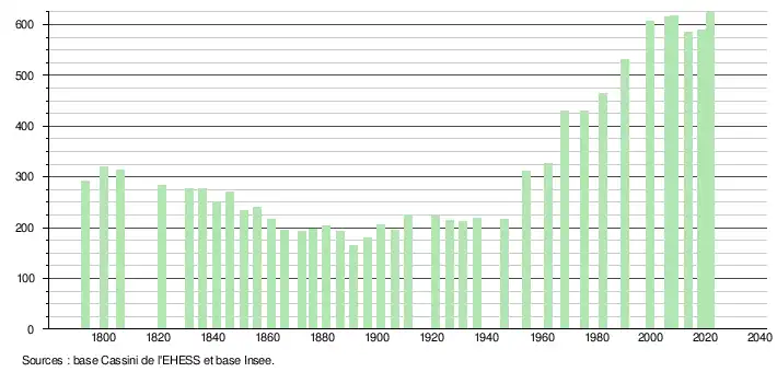 L'évolution du nombre d'habitants est connue à travers les recensements de la population effectués dans la commune depuis 1793. Pour les communes de moins de 10 000 habitants, une enquête de recensement portant sur toute la population est réalisée tous les cinq ans, les populations légales des années intermédiaires étant quant à elles estimées par interpolation ou extrapolation[32]. Pour la commune, le premier recensement exhaustif entrant dans le cadre du nouveau dispositif a été réalisé en 2008[33].