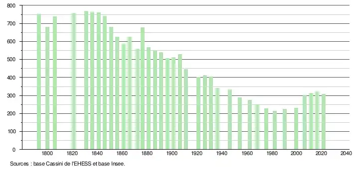 L'évolution du nombre d'habitants est connue à travers les recensements de la population effectués dans la commune depuis 1793. Pour les communes de moins de 10 000 habitants, une enquête de recensement portant sur toute la population est réalisée tous les cinq ans, les populations légales des années intermédiaires étant quant à elles estimées par interpolation ou extrapolation[20]. Pour la commune, le premier recensement exhaustif entrant dans le cadre du nouveau dispositif a été réalisé en 2006[21].