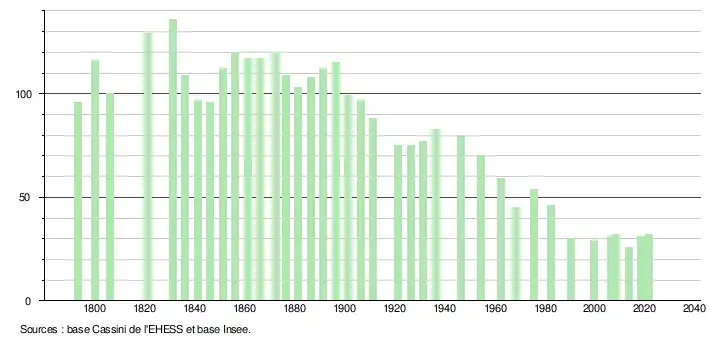 L'évolution du nombre d'habitants est connue à travers les recensements de la population effectués dans la commune depuis 1793. Pour les communes de moins de 10 000 habitants, une enquête de recensement portant sur toute la population est réalisée tous les cinq ans, les populations légales des années intermédiaires étant quant à elles estimées par interpolation ou extrapolation[17]. Pour la commune, le premier recensement exhaustif entrant dans le cadre du nouveau dispositif a été réalisé en 2008[18].