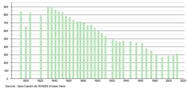- Dans le tableau des recensements et le graphique, par convention dans Wikipédia, le principe a été retenu, pour les populations légales postérieures à 1999 de n’afficher dans le tableau des recensements et le graphique que les populations correspondant à l'année 2006, première population légale publiée calculée conformément aux concepts définis dans le décret no 2003-485 du 5 juin 2003, et les années correspondant à une enquête exhaustive de recensement pour les communes de moins de 10 000 habitants, ainsi que la dernière population légale publiée par l’Insee.
