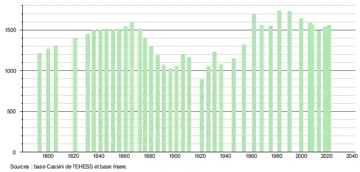 L'évolution du nombre d'habitants est connue à travers les recensements de la population effectués dans la commune depuis 1793. Pour les communes de moins de 10 000 habitants, une enquête de recensement portant sur toute la population est réalisée tous les cinq ans, les populations légales des années intermédiaires étant quant à elles estimées par interpolation ou extrapolation[25]. Pour la commune, le premier recensement exhaustif entrant dans le cadre du nouveau dispositif a été réalisé en 2008[26].